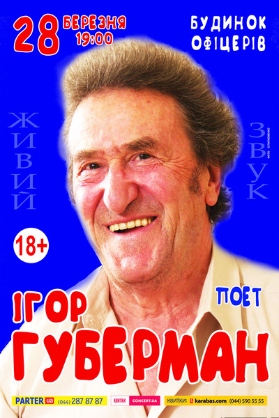 28 марта 2019 года в Центральном доме офицеров Киева состоится очередная традиционная встреча с самым читаемым русским поэтом, писателем, мудрецом и острословом, израильтянином Игорем Губерманом!!! Блестящий сочинитель четверостиший, которые издавна называют «гариками» в честь автора, в которых грусть соседствует с любовью (Окуджава), а юмор с неформальной лексикой, вошедший в большинство самых крутых собраний мудрых мыслей , блестящий прозаик и рассказчик – все это он, Игорь Миронович Губерман. А еще он харизматичный, ни на кого не похожий актер, его авторское чтение и рассказы мгновенно завоевывают доверие и внимание слушателей , о самых серьезных темах он говорит с юмором и иногда с горькой иронией. Фирменный драйв и энергетика, узнаваемый голос Губермана ,хлесткие тексты,заставляющие задуматься о будущем и загореться желанием что-то изменить в себе и вокруг себя – всё это мгновенно обращает на себя внимание слушателей. Те, кто услышал его однажды, остаются преданны ему до сих пор, а огромная аудитория поклонников растет с каждым годом.